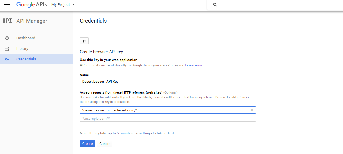 - On the Credentials page, name your Browser API Key and enter your domain name (preceded by an * and ending with a /*).