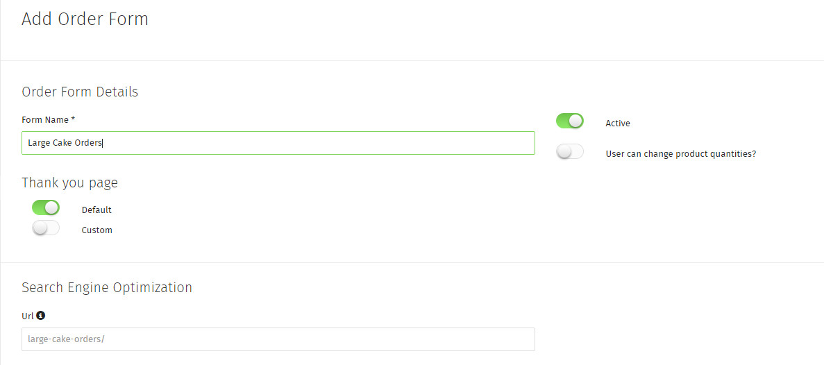 Before adding products to your Order Form, you will need to initially create it. On this page, set the Form Name. Since you're creating a new form, you will want to turn Active on, but you can always deactivate it later if need be. If you'd like your user to be able to change the amount of item they're buying, then go ahead and enable User can change product quantities?.