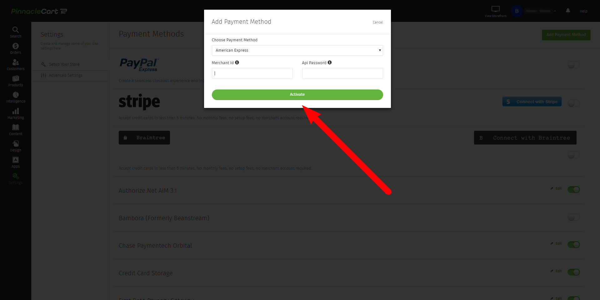 - Enter the Merchant ID and Api Password provided by American Express then click Activate.