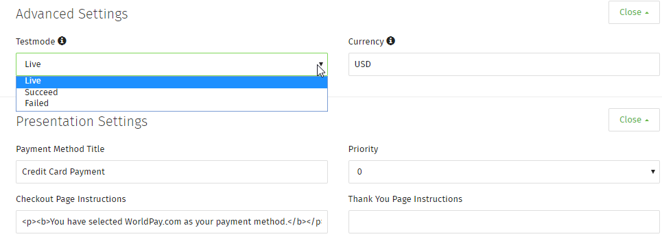 - To learn more about the test environment that operates behind the Worldpay Business Manager Test Mode, see the Test and Go Live Guide.