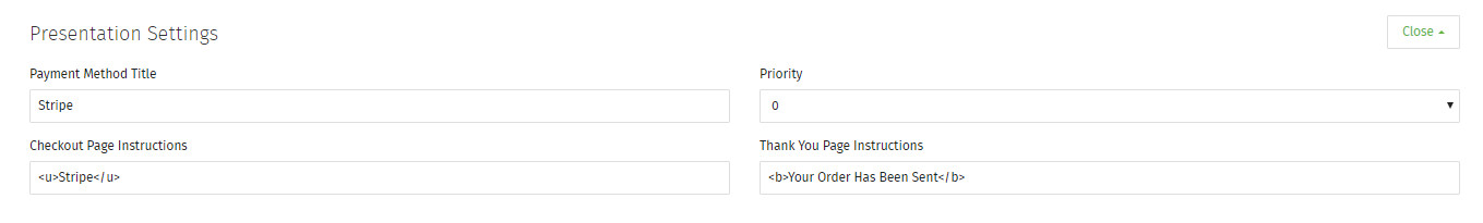 5. Now, click Edit to the right of Stripe. Expand Presentation Settings. Set the following: