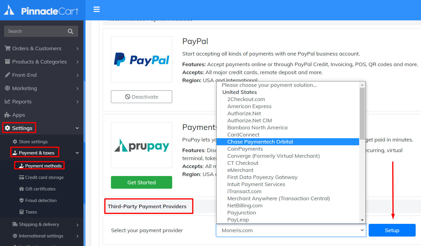 2. Under Third-Party Payment Providers, select Chase Paymentech Orbital from the drop-down list.