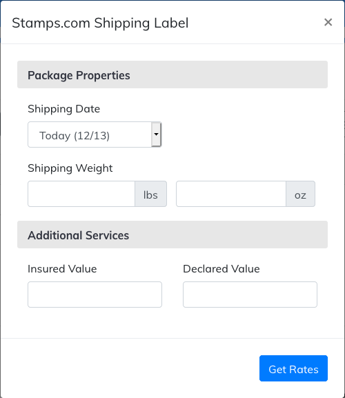 Now, in the Package Properties details, fill out the Shipping Date, Shipping Weight, and Insured Value. Click the 'Get Rates' button.